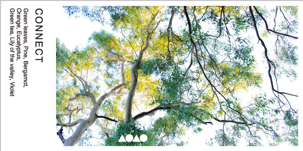 CONNECTの香りに使われているグリーンリーブは、草原のイメージを想起するだけでなく青葉に含まれるtrans-2-hexenal とCis-3-hexenolは、ストレスを軽減( Nakashima et al, 2004) オレンジは、不安レベルを低くポジティブなポジティブな気分をもたらしたり(Lehrner et al, 2000) 、主観的な注意力・各勢力を増加させる(Hongratanaworakit et al, 2005) と共に疲労度の軽減に寄与します。(Ahmadya et al, 2019) 松は副交感神経優位でリラックスするだけでなく(Ikei et al., 2016)抗炎症作用、抗菌作用、鎮痛作用、抗ストレス作用(Suntar et al., 2012)も検証されているため、エントランスで心理的にも清められるような清々しい気分にしてくれます。