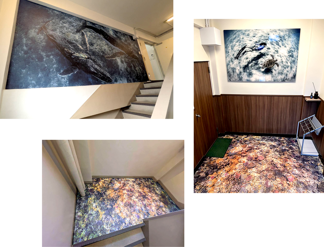 日本舶用エレクトロニクスの屋内階段スペースに設けられた「スポット美術館」は、会議への移動の途中など、ほんのひとときに海を五感で感じられる空間です。人々が行き交うこの場所には、人間と海の生物とのつながりをテーマにしたアート作品が展示されています。展示されているのは、水族表現家・二木あい氏による作品。世界各地の海に潜り、さまざまな海の生物との出会いを写真に収めた彼女の作品は、海や地球とのつながりを思い出させてくれるだけでなく、純粋な気持ちで自分自身と向き合うきっかけを与えてくれます。