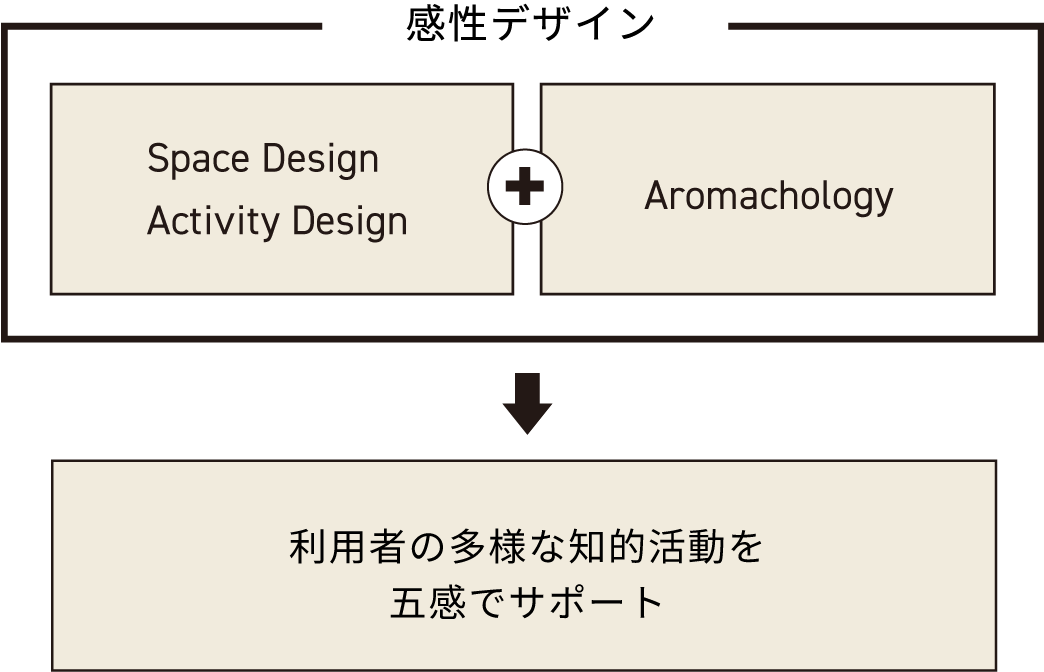 感性デザインは、空間とその場の体験を五感でつなげていく働きもします。空間アロマや音響は、空間デザインの要素でもあり、同時に利用者の活動をサポートする五感の要素でもあります。